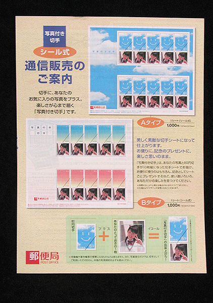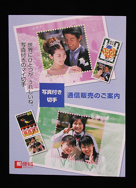 今の体質の郵便局ではこれがせいぜいのようです(2004年3月現在)。全面オリジナルデザインが可能になるにはいろんな意味でまだ時間がかかりそうです...... たしかに現場では見分けがつきにくいでしょうね。じつは郵便局では切手全面にお客さんの写真をあしらったものを発行する実験的なサービスがかつて存在したのです(たしか地域と期間限定でしたか、多摩サンリオ・ピューロランドの中とかで出張郵便局がやってました、入場料払うのか?)。それは最近見ませんね.... 結局は定常的なサービスにはならなかったのでしょうか。例のドラえもん事件に懲りてオリジナル切手クライシスともいうべき保守的精神がこうさせたのでしょうか。