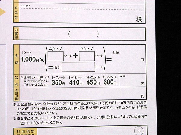 注文は1シート単位ということになっています。1シートは80円切手が10枚からなり合計の額面は800円ですが手数料に相当するのが200円ということで結局1シートで1000円です。1つの申込書で10シート(A/B選択では50シート)まで注文できます。これに納品時の自宅までの送料が加算されます。