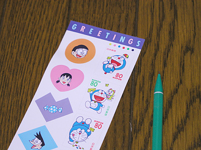 ● そんなかんだでワタクシ............ ハガキや封書、小荷物にはキッチリ、ルールどおりに切手をはらねばならんという一種の恐怖感といいますか違和感をず〜〜〜っと持ち続けてこのトシまで郵便局と付き合ってきたわけです。切手については「どうしてこんなヤボったいデザインのものしかないのよ?」と、常々不満もありました。切手といえば、かつて「ドラえもん切手」が1996年・1997年に発売されたときは一大事件で、九州から東京まで買いに行く人もいたほどのたいへんな話題であったにもかかわらず郵便局員が玩具シールと勘違いして配達しない事態が各地で起こったことは記憶に新しいです。じつは私、なぜか今でも持ってます.....ドラえもん切手。