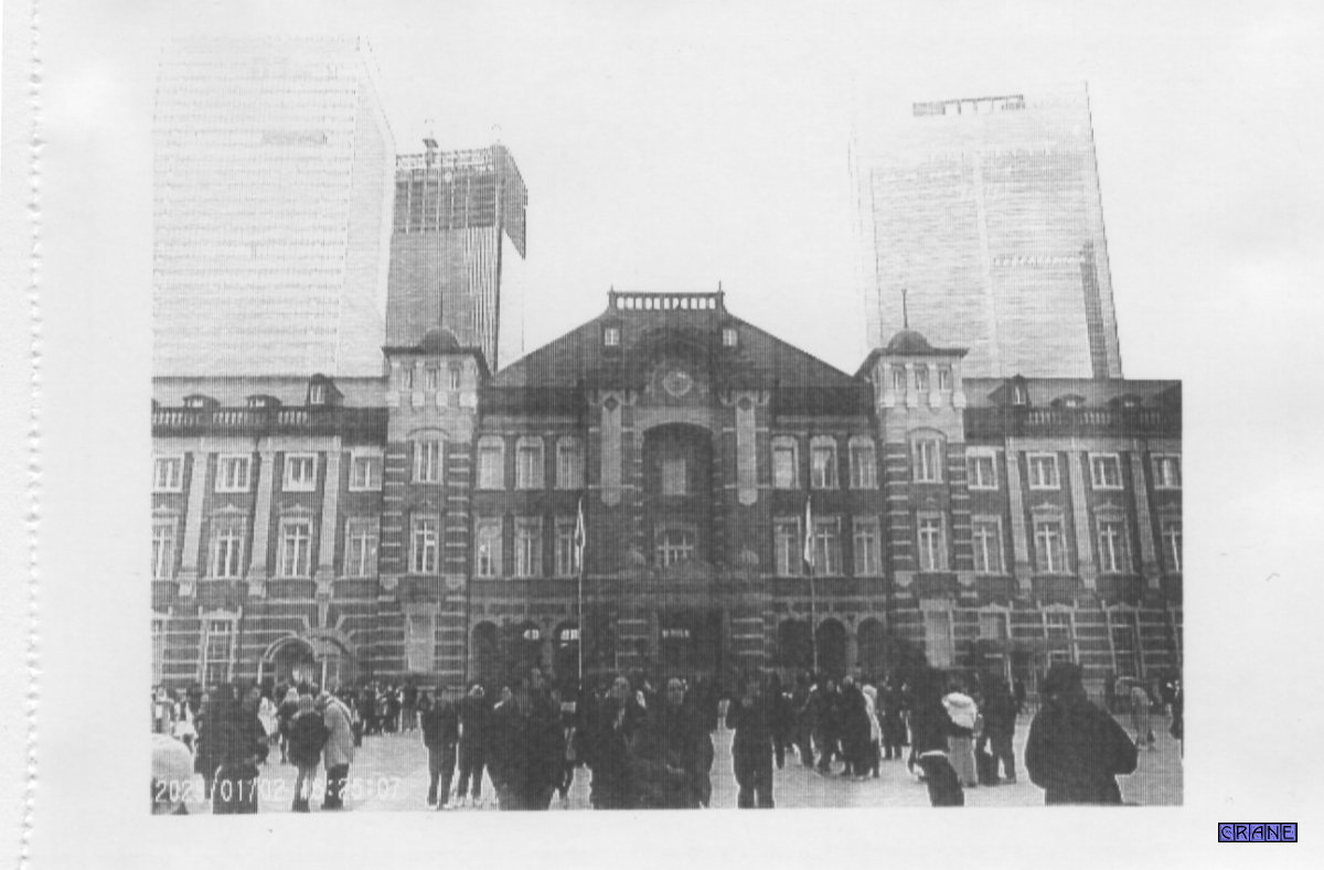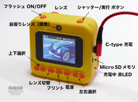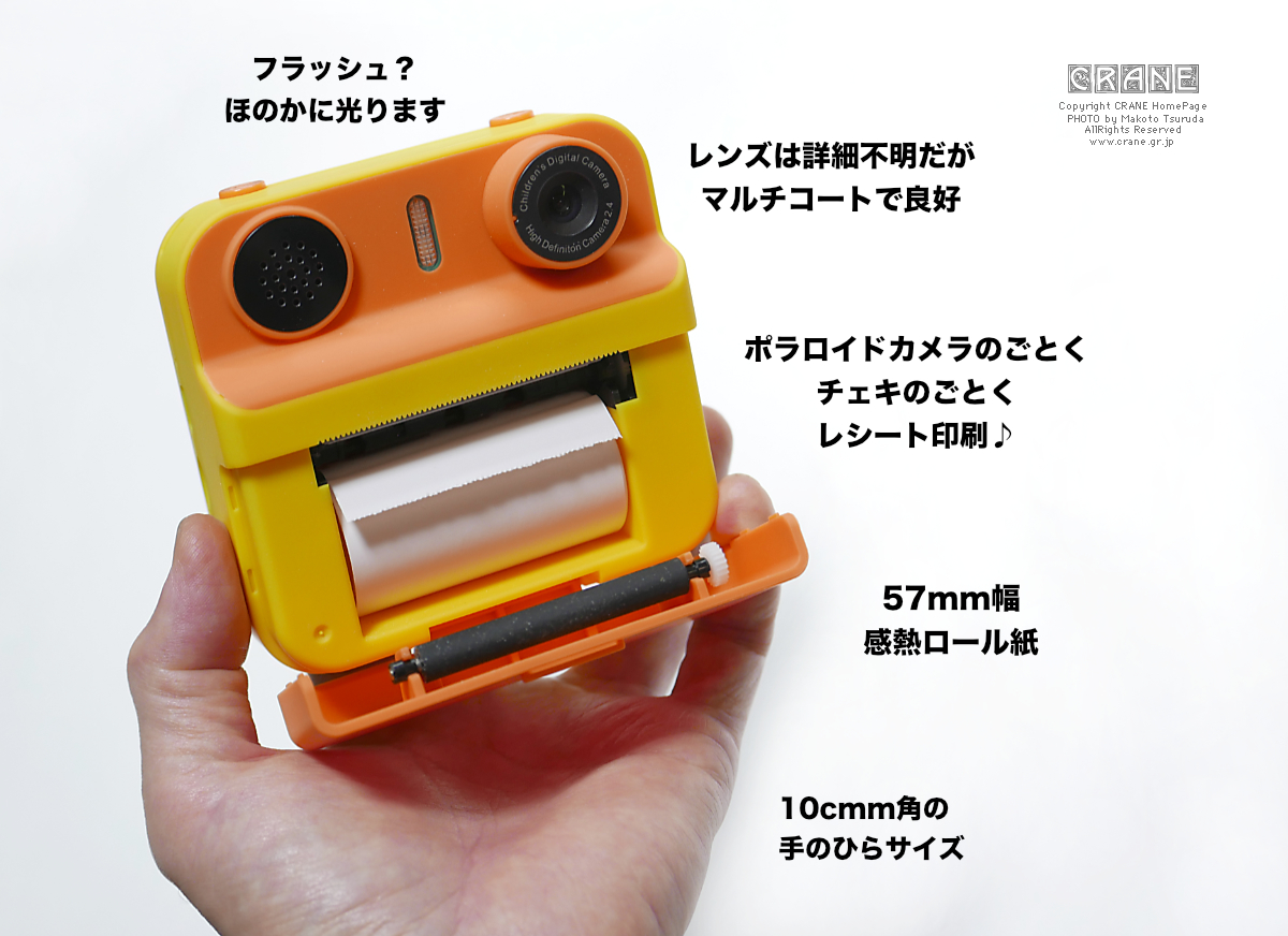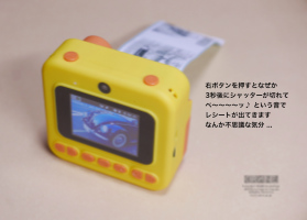 シャッターボタンは指で押して離すと瞬時にシャッターが切れるわけではなく、2秒ぐらい 経ってから画面が静止して撮れたことがわかります。同時にベ〜〜〜〜ッ!とプリントが開始されます。コンビニでお釣りをもらったり郵便局のお兄ちゃんが腰につけた装置で領収証を印刷するのと同じです。値札とか計算書が出てくる場所から写真が現れるので我々の世代からすればちょっと不思議な気分。