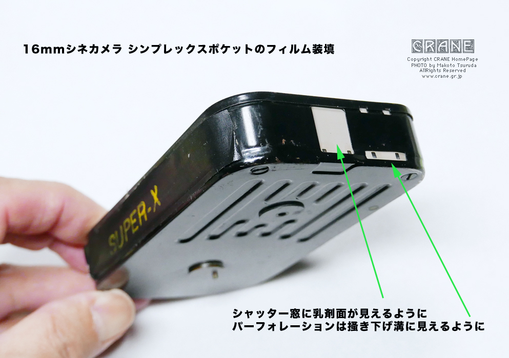 ・専用カートリッジへのフィルム装填:乳剤面をシャッター側に、片目フィルムなら掻き下げ爪(溝)側に穴がくるようにセットする。