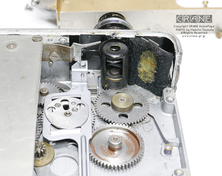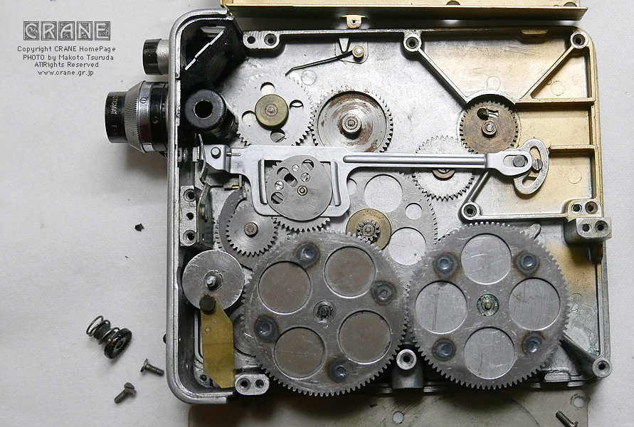 世界中で様々な16mmシネカメラが作られましたが、厚さ3cmという超薄型なのはシンプレックスだけだと思います。たいていは弁当箱のような「箱型」でした。2個の巨大なゼンマイが全重量の6割を占めていると思われるので、これを外して手動クランクのみで撮影できるようにしたら面白いカモしれません… 。