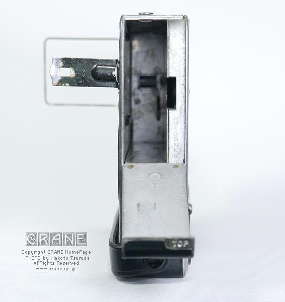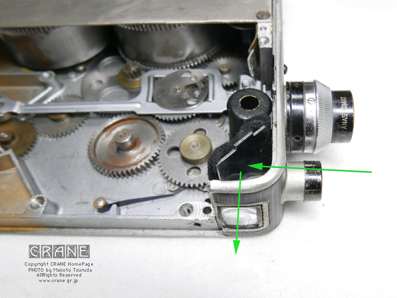 単純に凸レンズから入った光を鏡のように仕上げた金属板で反射しているだけなので、左右が逆なうえにレンズ近くから見ても結像せず20cm以上(いや、もっと!)離して見たときに像が得られる。フレーミング用ではあるけれど、ほとんど役に立たない。ボディ側面の針金のスポーツファインダーのほうがよっぽどマシ。