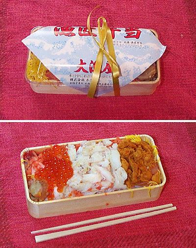 はじめてこの大漁屋さんの弁当を食べたのは忘れもしない2000年11月25日、京都駅地下の伊勢丹にて帰りの新幹線で食べるための夕食を物色していたところ偶然発見・捕獲したのでありました。そして今回、2001年1月31日に八王子そごうデパートの地下で再会したものです! 嗚呼感動の再会! カウンターの前にひざまずき感涙に打ち震える鶴田をご想像ください..........。上の写真は「大漁弁当」といいまして、このほかにも「漁匠弁当」、「カニ弁当」、「いくら弁当」などがあります。買ったら冷蔵庫に入れてはいけません、味が落ちます。その日のうちに食べましょう。醤油もかけずにそのままいただくのが最もゼイタクで美味しくいただく作法であります。