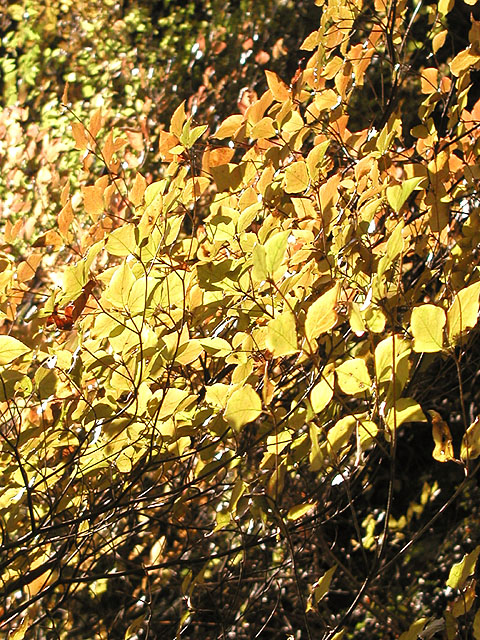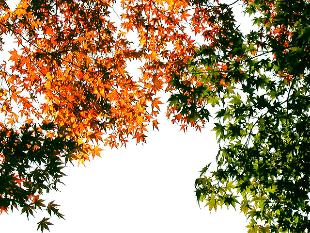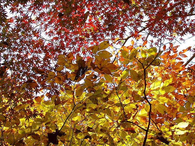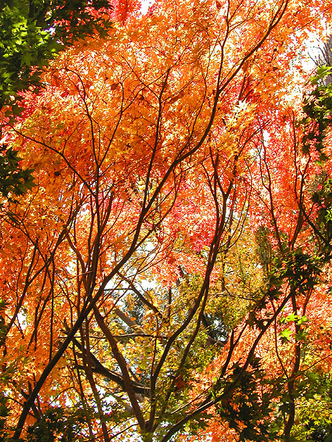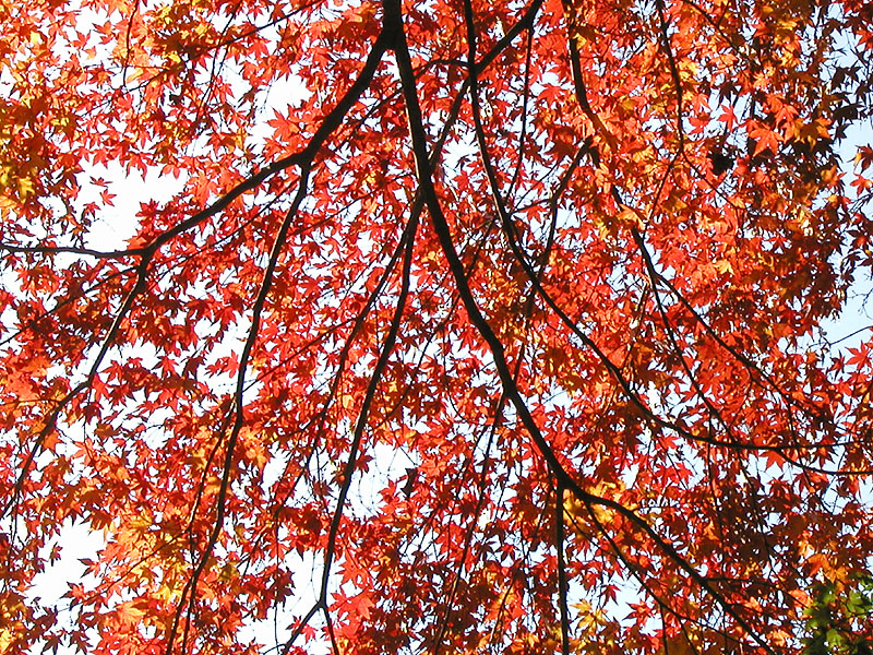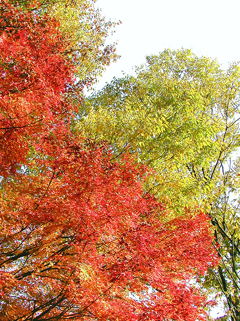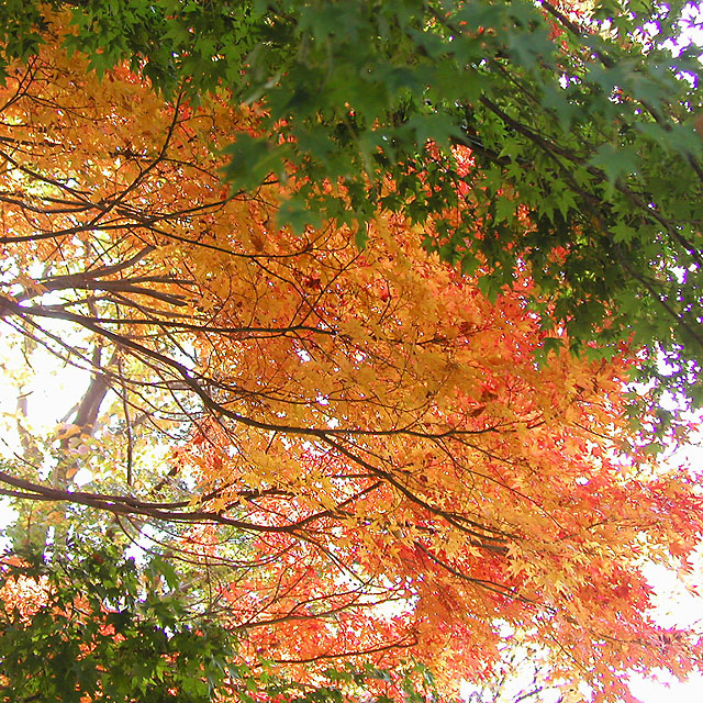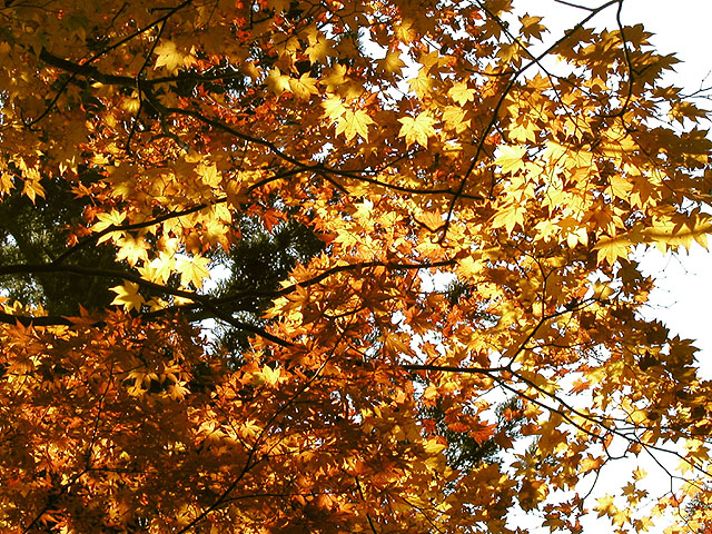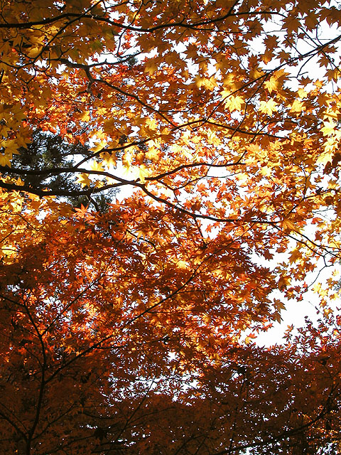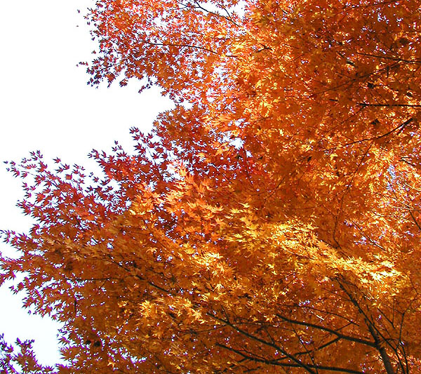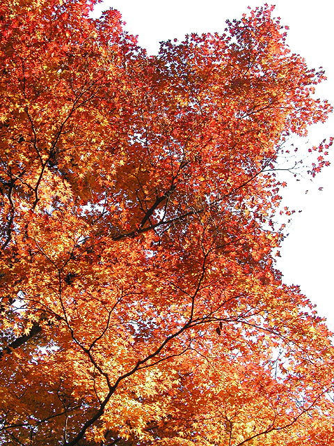■ 備考:紅葉の撮影は極端なシャドウ部とハイライト部が混在することが多いです。つまりこの写真のように木の幹は真っ暗で、背景はまぶしい青空、そして木の葉は光を受けて(透過)明るく黄色に輝いているものもあれば日陰で暗い色の葉もある.....といったぐあい。カメラ好きの方で、あれこれ撮影経験のある方は御存知かと思いますが、こういった撮影では露出(シャッタースピードと絞り)をどういったテーマに設定するか、といった点が重要になります。つまり木の幹の質感(ゴツゴツした感じ)をしっかり表現したいのであれば全体は明るく飛んでしまいますし、逆に陽にかざした葉をテーマとして表現したいのであれば全体は暗くならざる得ないのであります。両方ともハッキリ・クッキリに撮影するのは無理なのです(ほかに特殊な手段はあるけど)。