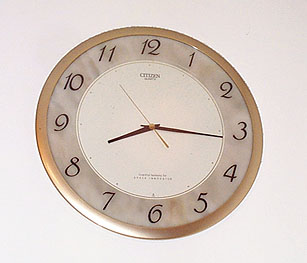 この写真の時計は1995年頃にようやく捜し出して購入したものです。厚さが1cmしかないんですよ!! レンズや針も薄くて壁にペッタリ貼り付き、忍者(ショー・コスギかっ?)のごとく日々確実に時を刻みます。ほんとは振子時計が欲しかったのですが部屋にクギとか打てないのと、しょっちゅうゼンマイを巻くゆとりがないことを踏んでの選択だったのです。