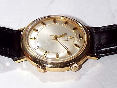 かつて、パテック・フィリップ社にムーブメントを供給していたこともあるというスイスの名門ジャガー・ルクルト社の代表作「MEMOVOX」です。MEMOVOXには自動巻や日付機能、ワールドタイムなど様々な機能を合わせ持ったモデルが存在しますが、これは1950年ごろのシンプルなモデルで薄いのが魅力です。レビュー・トーメンとは異なる機構で、音はやや低く、振動が大きめです。これなら「ジィ〜〜〜ブルブル〜〜」という感じなので夜間でもOK?!