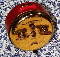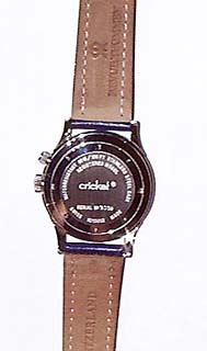 しかも中には製造番号付きのオーナー証明書 が付属(ここまでやるか!)。それから1年保証書と使用法の解説書が1枚付いています。そしてなんと、時計自体はオリジナル缶ケース(コレがまたイイ)に納められています。やってくれますね〜〜〜! 泣けるねぇ〜〜! 随所にこだわりが感じられます。裏ブタには反響版が付いており、なかなかの効果があります。ストラップもこの価格にしては珍しく革を採用しています。たんなるお遊び時計とはちがうのだ! 超真剣お遊び時計なのだ! プロデュースしたテレブランド社のホームページも御覧くだされ。ちなみに発音するため3個のボタン電池を必要とします(いいぞ〜〜!?)。