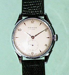 PIERCEはヨーロッパの軍用時計などを多く生産していたようです。これは販売店で整備されたものを購入したので、現在でも全くトラブルはありません。 文字盤がほどよく焼けて渋いのであります。ROLEXやOMEGAのように人気のある時計には非オリジナルのハンド(針のこと)やシロウトが注油(時計用のオイルはマスの油とかが使われるらしい)して、にじんでいるものを見かけることがあります、要注意。
