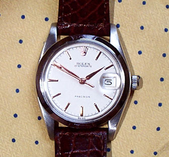 解説:1950年代。オイスターデイト。機械式手巻き。デイト表示。SSケース。風防は硬質プラスチック。ケース径34mm。ベルト19mm。針の形状と色に注目。