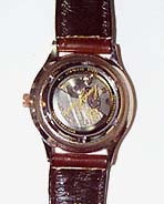 先日、久しぶりに渋谷の某LOFTに出かけたときのことです、SWATCHやG-SHOCKに囲まれてポツンとアンティークショーケースがありまして、偶然コイツを見つけたのです。ワタシは音の出るモノには自分でも不思議なぐらいの執着心があるようで、この日もしっかり衝動買いしてしまいました。デート機能が付いてアラームが鳴り、かつ耐磁ケース、しかも1年保証付きぢゃ。新品同様のデッドストックのわりにはスッゴク安価でした(全体的にちょっと安っぽいけど)。インカブロック採用で、日付変更は9時〜12時間のリターン式。難点を挙げるならば、メッキが薄そうで腐食が心配なことと、腕に付けてアラームを鳴らすと音量が半分以下になって「ギョォ〜〜ジジジ〜〜」っという具合に情けない......じつに控えめでカワイイヤツなのです、ギャハハハ.....。このメトロポリスというメーカーはいくつかの異なる裏ブタのものが存在し、ORISなどが見られることがあります。